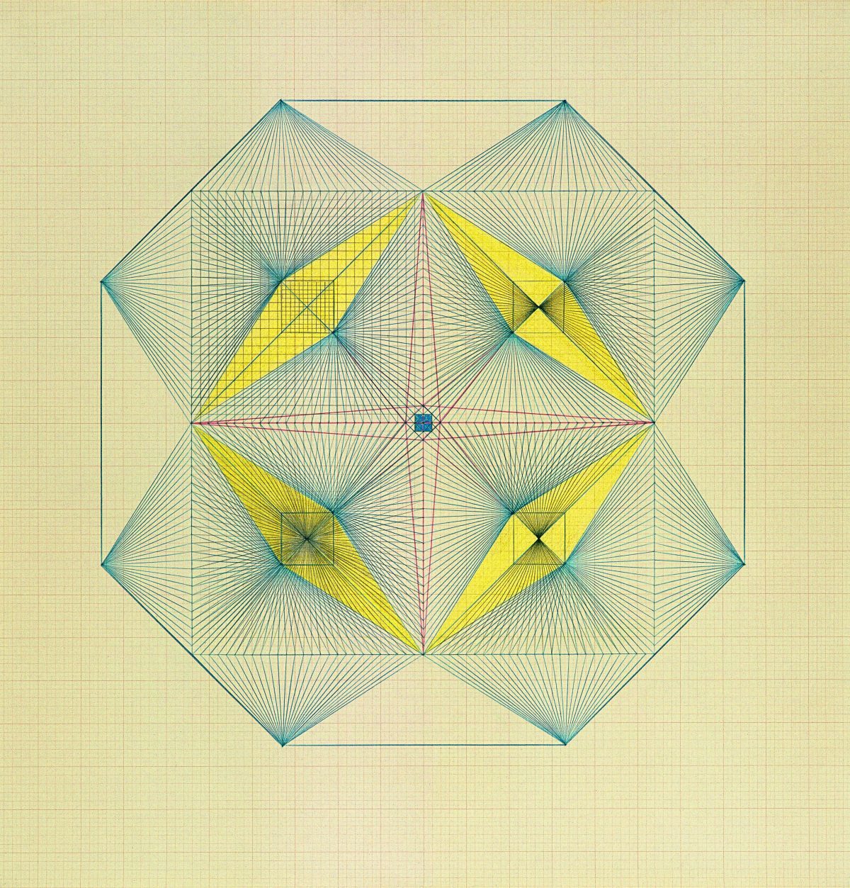 Looking at one of her drawings for the first time, my computational thinking was triggered. Clearly the piece followed some geometrical system, but one that felt rich and unaproachable through everyday logical analysis. I decided to use coding to explore the art further. Coding is a contemporary tool for thinking. By reproducing the drawings in code, I would have to pay attention to every detail and how they relate to the whole.